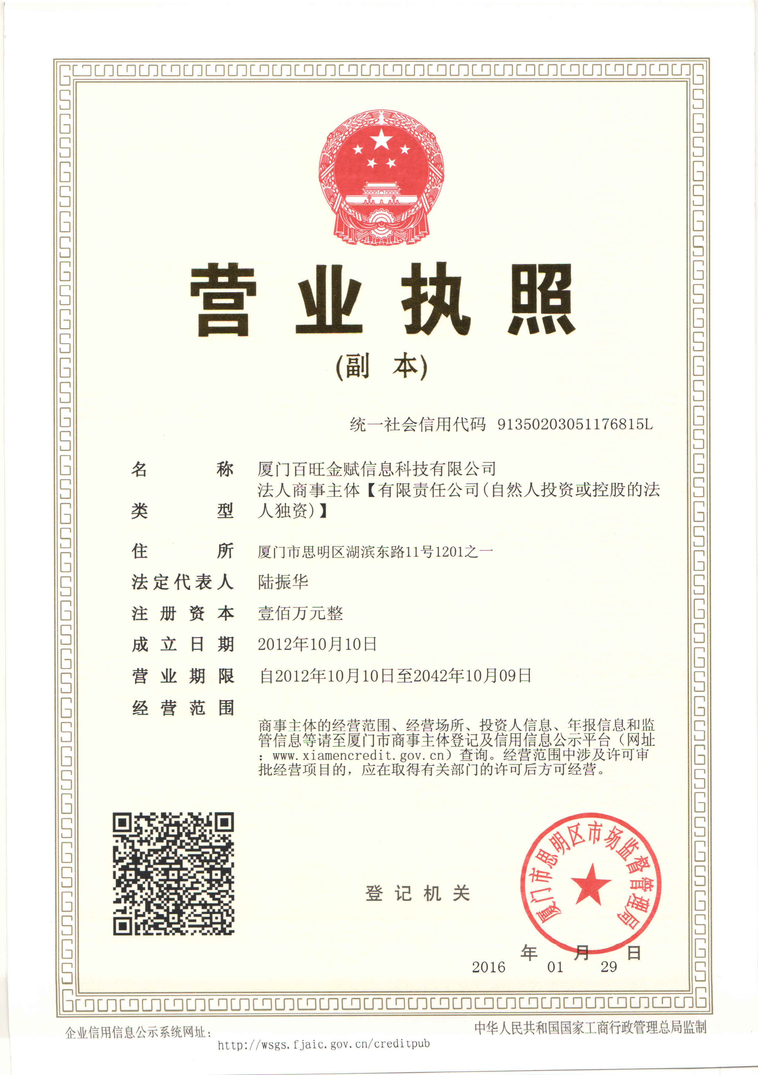 厦门百旺金赋信息科技有限公司是国家信息安全工程技术研究中心授权负责厦门地区税控系统推广与服务的单位,为厦门地区增值税发票(税控盘版)的推广和应用保驾护航。公司业务涉及国税增值税发票开票系统、机动车销售统一发票开票系统、货运增值税专票开票系统、发票网上认证系统、税控设备销售、电脑及针式打印机销售、发票相关的增值软件销售等。